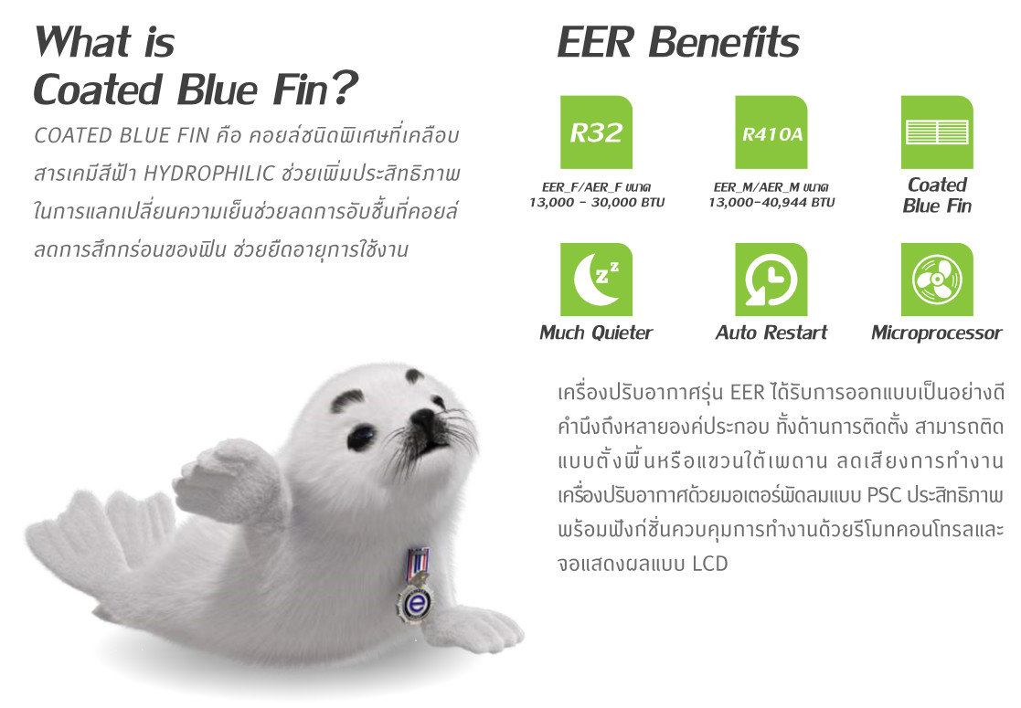 - COATED BLUE FIN (ใหม่)เพิ่มประสิทธิภาพการประหยัดไฟ ด้วยคอยลชนิดพิเศษที่เคลือบสารเคมีสีฟ้า HYDROPHILIC ช่วยเพิ่มประสิทธิภาพในการแลกเปลี่ยนความร้อน ช่วยลดการอับชื้นที่คอยล์ ลดการสึกกร่อนของฟิน ยืดอายุการใช้งาน* ยกเว้นรุ่น EER 1050, EER 1050T, EER 1301, EER 1301T ทั้งไฟ 220 V. และ 380 V.