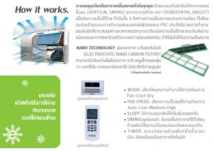 - ระบบหมุนเวียนอากาศเย็นสบายทั่วถึงทุกมุม ด้วยระบบสวิงอัตโนมัติ กระจายลมขึ้นลง (VERTICAL SWING) และกระจายลมซ้าย-ขวา (HORIZONTAL ADJUST) เพื่อส่งความเย็นได้ไกล ทั่วถึงทั้ง 4 ทิศทาง