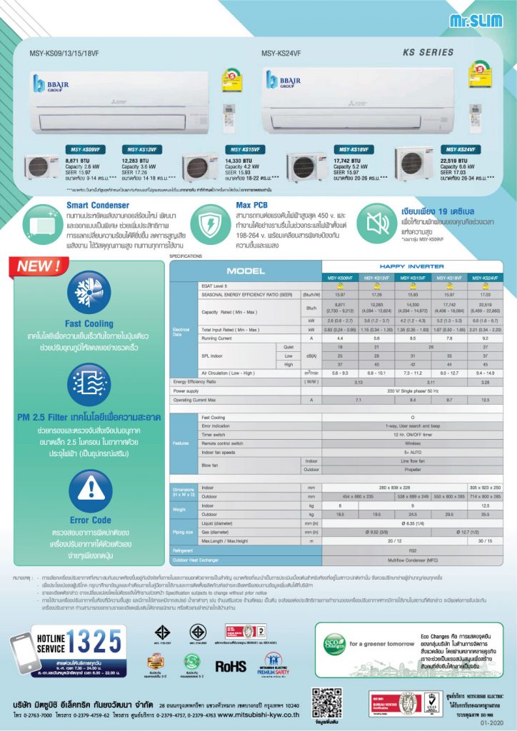 - รับประกัน คอมเพรสเซอร์ 5 ปี แผงคอล์ยเย็นและแผงคอล์ยร้อน 3 ปี อะไหล่ภายในเครื่อง 1 ปี